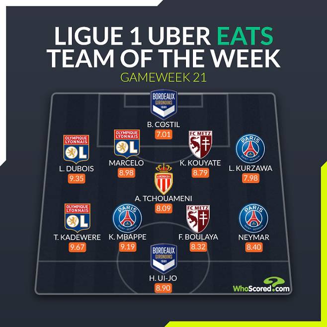 황의조는 26일 축구 통계 전문 후스코어드닷컴이 선정한 프랑스 리그1 팀오브더 위크 베스트11에 뽑혔다. 황의조는 평점 8.90을 받아 최전방 원톱에 당당히 이름을 올렸다. 2선 공격진에는 킬리안 음바페(9.19점·PSG)와 네이마르(8.40점·PSG) 등 쟁쟁한 별이 함께 선정됐다.