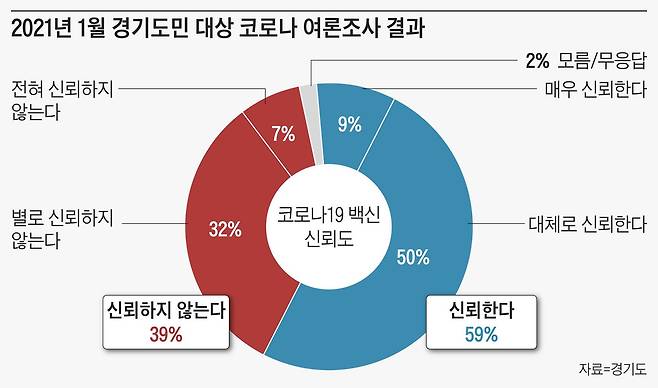 경기도가 여론조사기관에 의뢰해 도민 1000명을 대상으로 코로나 관련 여론조사를 실시한 결과, 코로나 백신에 대해 ‘신뢰한다'는 응답이 59%로 ‘신뢰하지 않는다’는 응답 39%보다 높았다고 26일 밝혔다.