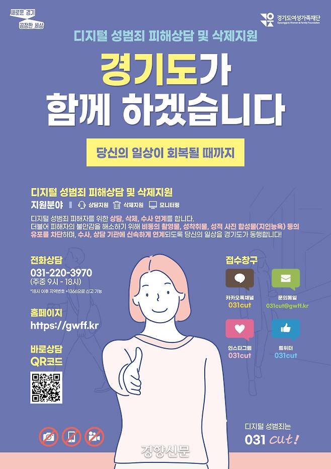 다음 달부터는 피해 상담과 법률 지원, 영상 삭제 요청 등을 전담할 ‘경기도 디지털 성범죄 피해자원스톱지원센터’도 설치·운영할 예정이다.