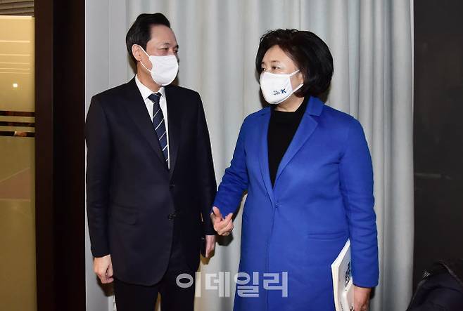 [이데일리 노진환 기자] 서울시장 재보궐 선거에 출마하는 우상호 더불어민주당 의원, 박영선 전 중소벤처기업부 장관이 26일 서울 여의도 글래드호텔에서 열린 '경기도 기본주택 토론회'에 참석해 대화를 나누고 있다.