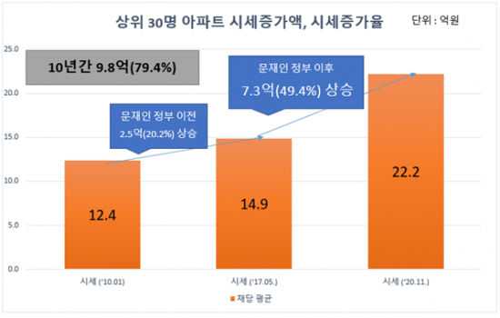 30명이 보유한 아파트 가격도 크게 오른 것으로 나타났다. 이들이 보유한 아파트는 2010년 12억4000만원에서 지난해 11월 22억2000만원으로 9억8000만원(79.4%) 상승했다. 이 중 문재인 정부 4년 동안 상승한 금액이 7억3000만원에 달했다. 특히 서울에 아파트를 보유한 이들은 그동안 평균 9억1000만원의 상승을 경험했고, 서초구(10억9000만원 상승), 송파구(10억3000만원 상승), 강남구(9억8000만원 상승) 순으로 많았다.