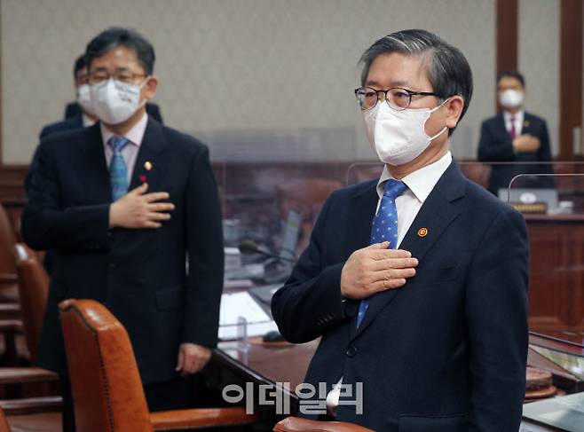 [이데일리 김태형 기자] 변창흠(오른쪽) 국토교통부 장관 및 국무위원들이 6일 오전 서울 종로구 정부서울청사에서 열린 국무회의에서 국민의례를 하고 있다.