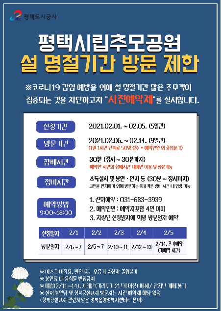 경기도 평택도시공사(사장 김재수)는 코로나19 확산을 방지하기 위해 설 명절 기간 포함 2월 6일부터 14일까지 9일간 평택시립추모공원을 사전예약제로 운영한다.
