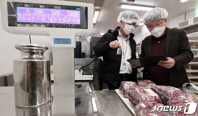 (안산=뉴스1) 조태형 기자 = 민족대명절 설을 보름여 앞둔 26일 오전 경기도 안산시내 한 마트에서 단원구청 민원봉사과 관계자들이 분동을 이용해 계량기를 점검하고 있다. 2021.1.26/뉴스1