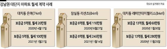 부동산정보업체 ‘아실’에 따르면 대치동 래미안대치팰리스 84㎡은 올해 1월20일에 쓴 월세계약이 보증금 6억3060만원에 440만원이었고, 지난해 11월엔 8억원(보증금)·323만원(월세), 10월엔 10억원·209만원 등 거래가 나왔다. 잠실동 리센츠 84㎡도 이번달 들어 3억원·255만원, 6억원·245만원 월세계약이 이뤄졌고, 지난해 12월에는 8억원·150만원, 10억원·100만원, 12억원·60만원 등 보증금의 규모가 큰 반전세 형태의 계약도 많이 나타났다.