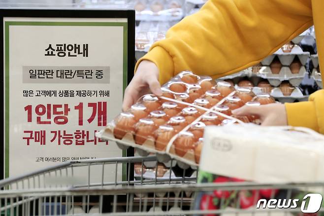 (안산=뉴스1) 조태형 기자 = 26일 오전 경기도 안산시내 한 마트에 계란 판매를 1인당 1판으로 제한하는 안내문이 부착돼 있다.