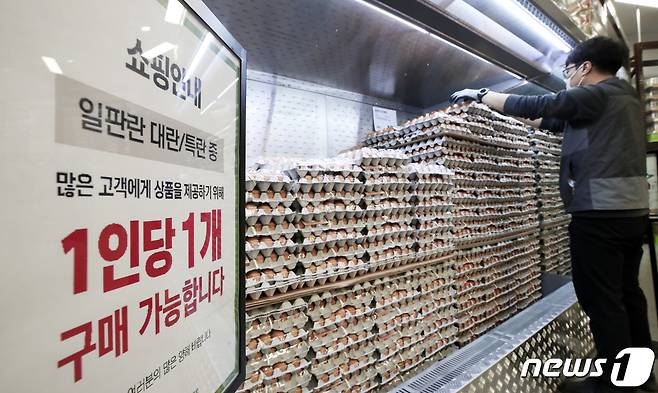 (안산=뉴스1) 조태형 기자 = 26일 오전 경기도 안산시내 한 마트에 계란 판매를 1인당 1판으로 제한하는 안내문이 부착돼 있다.