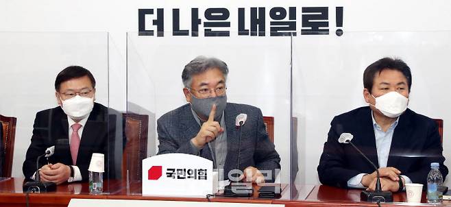 [이데일리 노진환 기자] 정진석 국민의힘 4.7 재보궐선거 공천관리위원장이 26일 국회에서 면접심사 결과를 발표한 뒤 기자들의 질문에 답변하고있다.