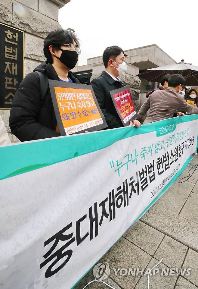 (서울=연합뉴스) 이재희 기자 = 26일 오전 서울 종로구 헌법재판소 앞에서 노동운동단체 권리찾기유니온 주최로 열린 '중대재해처벌법 헌법소원 청구 기자회견'에서 청구인 및 담당 변호사들이 손팻말을 들고 있다. 2021.1.26