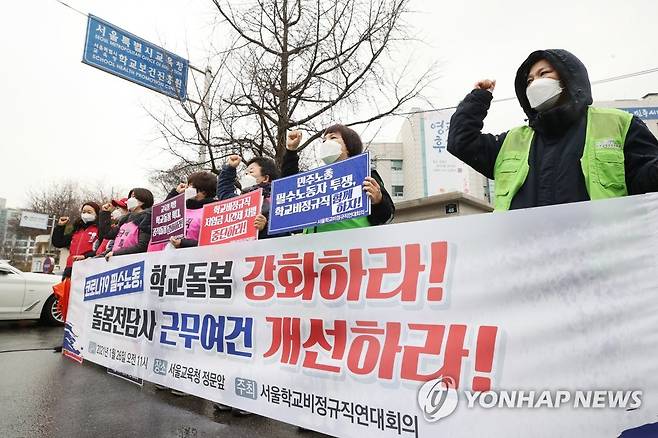 (서울=연합뉴스) 강민지 기자 = 서울학교비정규직연대회의가 26일 오전 서울 종로구 서울시교육청 앞에서 '코로나19 필수노동자, 돌봄전담사 2021년 투쟁 선포 기자회견'을 하고 있다. 2021.1.26