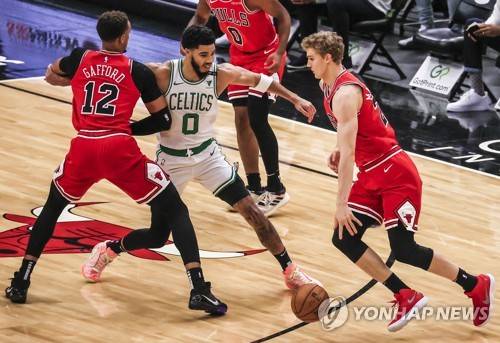 epa08965638 Chicago Bulls center Daniel Gafford (L) blocks Boston Celtics forward Jayson Tatum (C) as Chicago Bulls forward Lauri Markkanen (R) of Finland drives around them during the NBA basketball game between the Boston Celtics and the Chicago Bulls at the United Center in Chicago, Illinois, USA, 25 January 2021. EPA/TANNEN MAURY SHUTTERSTOCK OUT