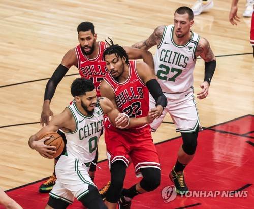epa08965637 Boston Celtics center Daniel Theis of Germany (R) and Chicago Bulls guard Garrett Temple (2-L) watch as Boston Celtics forward Jayson Tatum (L) drives around Chicago Bulls forward Otto Porter Jr. (2-R) during the NBA basketball game between the Boston Celtics and the Chicago Bulls at the United Center in Chicago, Illinois, USA, 25 January 2021. EPA/TANNEN MAURY SHUTTERSTOCK OUT