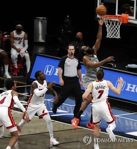 epa08965639 Brooklyn Nets guard James Harden (R) puts up a shot past a defending Miami Heat guard Kendrick Nunn (L) and teammate Miami Heat guard Goran Dragic (R) in the second half of the NBA basketball game between the Miami Heat and the Brooklyn Nets at the Barclays Center in Brooklyn, New York, USA, 25 January 2021. EPA/JASON SZENES SHUTTERSTOCK OUT