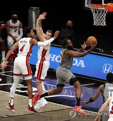 epa08965641 Brooklyn Nets guard James Harden (R) looks to pass past a defending Miami Heat forward KZ Okpala (L) and teammate Miami Heat guard Goran Dragic (C) in the second half of the NBA basketball game between the Miami Heat and the Brooklyn Nets at the Barclays Center in Brooklyn, New York, USA, 25 January 2021. EPA/JASON SZENES SHUTTERSTOCK OUT