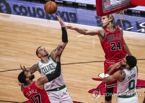 epa08965643 Boston Celtics center Daniel Theis of Germany (2-L) and Chicago Bulls forward Lauri Markkanen of Finland (2-R) reach for a rebound between Chicago Bulls guard Garrett Temple (L) and Boston Celtics forward Jayson Tatum (R) during the NBA basketball game between the Boston Celtics and the Chicago Bulls at the United Center in Chicago, Illinois, USA, 25 January 2021. EPA/TANNEN MAURY SHUTTERSTOCK OUT