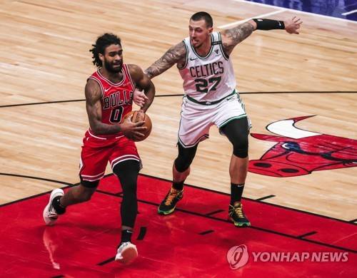 epa08965692 Chicago Bulls guard Coby White (L) drives on Boston Celtics center Daniel Theis of Germany (R) during the NBA basketball game between the Boston Celtics and the Chicago Bulls at the United Center in Chicago, Illinois, USA, 25 January 2021. EPA/TANNEN MAURY SHUTTERSTOCK OUT