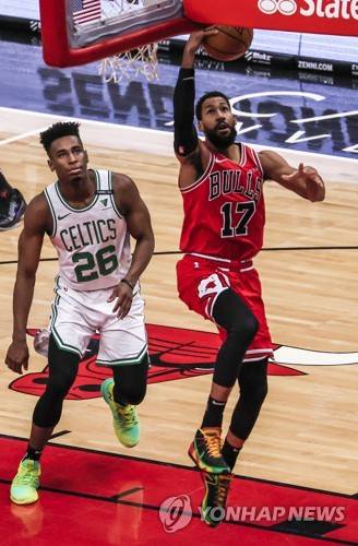 epa08965690 Chicago Bulls guard Garrett Temple (R) shoots in front of Boston Celtics guard Aaron Nesmith (L) during the NBA basketball game between the Boston Celtics and the Chicago Bulls at the United Center in Chicago, Illinois, USA, 25 January 2021. EPA/TANNEN MAURY SHUTTERSTOCK OUT