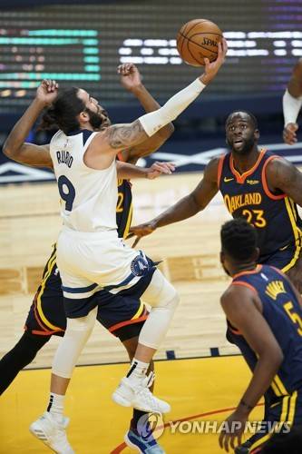epa08965696 Minnesota Timberwolves guard Ricky Rubio of Spain (L) goes to the basket for two points against the Golden State Warriors during the first half of the NBA basketball game between the Minnesota Timberwolves and Golden State Warriors at the Chase Center, in San Francisco, California, USA, 25 January 2021. EPA/JOHN G. MABANGLO SHUTTERSTOCK OUT