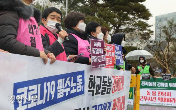 서울학교비정규직연대회의 소속 조합원들이 26일 서울시교육청 앞에서 '코로나19 필수노동자, 돌봄전담사 2021년 투쟁선포 기자회견'을 열고 있다. 이들은 학교돌봄 강화와 돌봄전담사 근무여건 개선 등을 촉구했다.