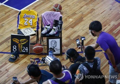 epa08965713 Fans and media take footage of memorabilia of the late basketball player Kobe Bryant at a basketball facility dubbed 'House of Kobe' during a ceremony marking his first death anniversary in Valenzuela City, Metro Manila, Philippines, 26 January 2021. Bryant and his 13-year-old daughter were killed along with seven others in a helicopter crash in Calabasas, California, USA on 26 January 2020. EPA/ROLEX DELA PENA