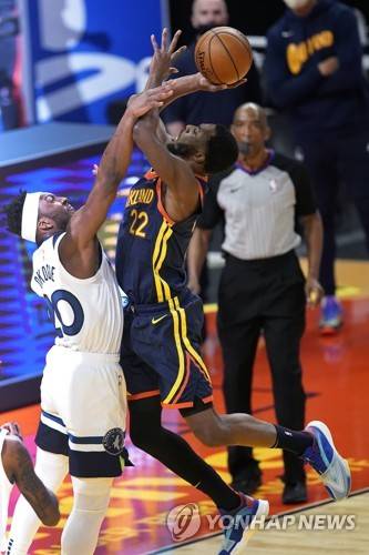 epa08965716 Golden State Warriors forward Andrew Wiggins (R) goes to the basket as Minnesota Timberwolves guard Josh Okogie (L) defends during the first half of the NBA basketball game between the Minnesota Timberwolves and Golden State Warriors at the Chase Center, in San Francisco, California, USA, 25 January 2021. EPA/JOHN G. MABANGLO SHUTTERSTOCK OUT