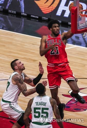 epa08965723 Chicago Bulls forward Thaddeus Young (R) shoots on Boston Celtics guard Jeff Teague (C) and Boston Celtics center Daniel Theis of Germany (L) during the NBA basketball game between the Boston Celtics and the Chicago Bulls at the United Center in Chicago, Illinois, USA, 25 January 2021. EPA/TANNEN MAURY SHUTTERSTOCK OUT