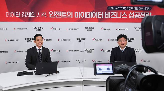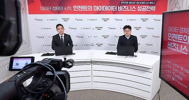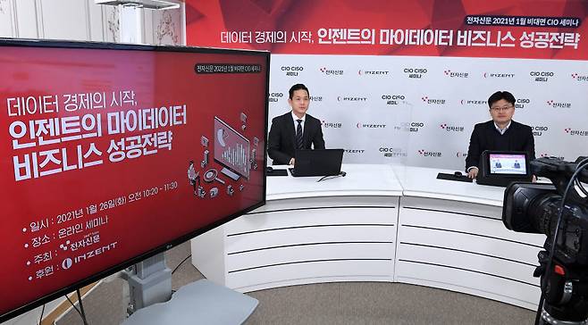 전자신문이 주최하고 인젠트가 후원하는 비대면 CIO 세미나가 '26일 서울 영등포구 전자신문사에서 열렸다. 남재욱 인젠트 이사(왼쪽)와 박병규 인젠트 이사가 '인젠트의 마이데이터 비즈니스 성공전략'을 주제로 발표하고 있다.