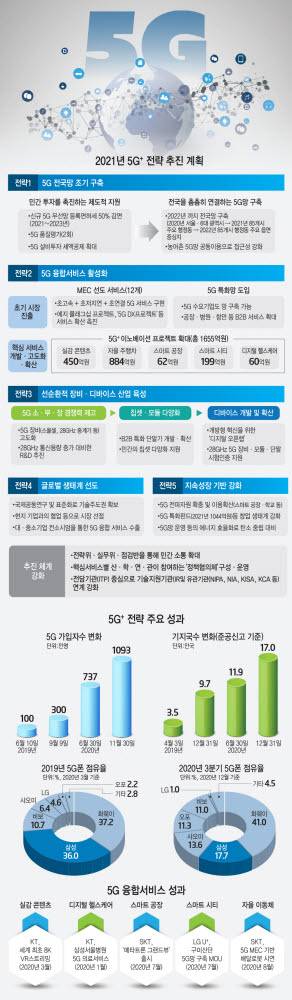 5G 전국망을 조기 구축하고, 5G 융합서비스 활성화를 위한 선도서비스 개발, 글로벌 5G 시장 선점 등 2021년을 5G+ 융합생태계 조성의 원년으로 만들자는 데 공감했다.