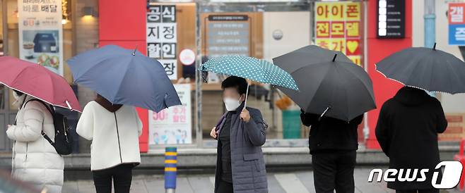 (제주=뉴스1) 오현지 기자 = 전국에 비가 내리는 26일 오후 제주시 이도이동 한 거리에서 우산을 쓴 시민들이 발걸음을 옮기고 있다. 2021.1.26/뉴스1