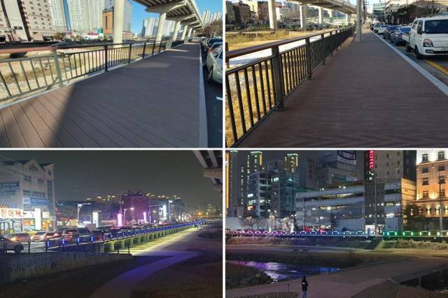 기존의 협소한 인도는 철거한 뒤 목재데크로 폭 2.5m 이상의 인도를 새로 만들고 난간엔 다채로운 색상의 LED조명을 설치해 시민들에게 다양한 볼거리를 제공했다.