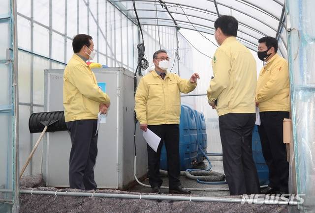 [홍성=뉴시스]유효상 기자 = 충남도 내 가금류 농가 48곳에서 최근 한 달여 사이에 고병원성 조류독감(AI)이 발생한 가운데 김명선 도의회 의장이 26일 당진시 거점소독시설을 방문, 방역 상황을 점검하고 있다. (사진=충남도의회 제공) 2021.01.26 photo@newsis.com
