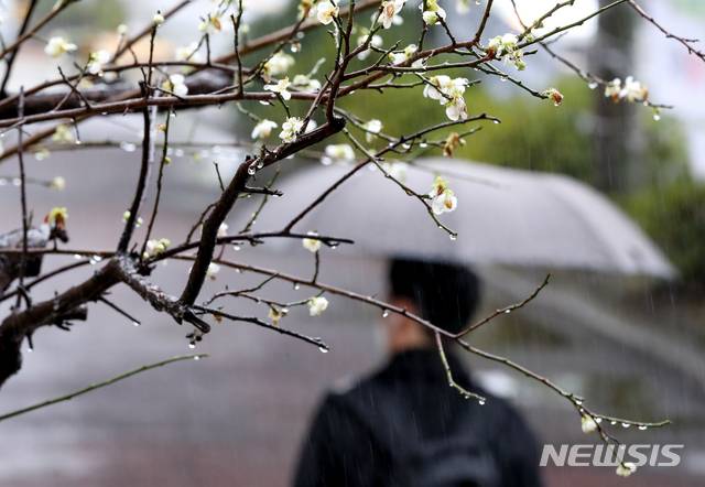 [제주=뉴시스]우장호 기자 = 겨울비가 촉촉히 내린 26일 오후 제주시 연동의 한 거리에 청매화가 활짝 꽃을 피워 시나브로 다가오는 봄기운을 느끼게 한다. 2021.01.26. woo1223@newsis.com