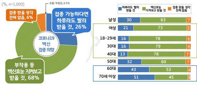 백신을 언제 접종받기를 원하는지 묻는 항목에서는 ‘부작용 등 백신 효능을 지켜보고 받겠다’(68%)는 응답이 ‘가능하다면 하루라도 빨리 접종받겠다’(26%)는 응답보다 2.6배나 많았다.