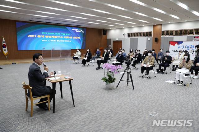 [홍성=뉴시스]유효상 기자 = 충남도 주관으로 26일 도청 대회의실에서 동계 행정체험에 참여 중인 대학생들과 소통의 시간이 마련된 가운데 양승조 충남지사가 '청년이 살고 싶은 충남, 충남의 미래 발전을 위한 준비' 등에 대한 질문을 듣고 답변을 해주고 있다. (사진=충남도 제공) 2021.01.26 photo@newsis.com