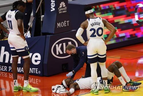 epa08965787 Minnesota Timberwolves forward Jarred Vanderbilt lays on the court injured after drawing a foul by Golden State Warriors forward Draymond Green during the second half of the NBA basketball game between the Minnesota Timberwolves and Golden State Warriors at the Chase Center, in San Francisco, California, USA, 25 January 2021. EPA/JOHN G. MABANGLO SHUTTERSTOCK OUT