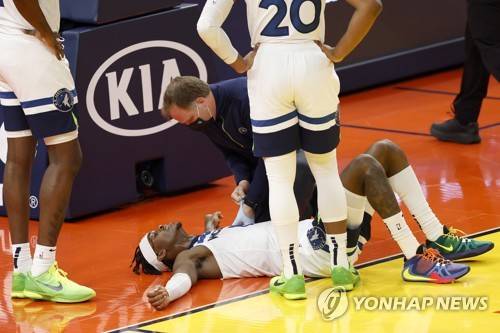 epa08965788 Minnesota Timberwolves forward Jarred Vanderbilt lays on the court injured after drawing a foul by Golden State Warriors forward Draymond Green during the second half of the NBA basketball game between the Minnesota Timberwolves and Golden State Warriors at the Chase Center, in San Francisco, California, USA, 25 January 2021. EPA/JOHN G. MABANGLO SHUTTERSTOCK OUT