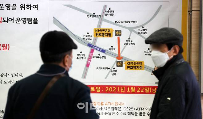 은행들이 코로나19로 비대면 거래가 증가하면서 높은 비용이 드는 은행점포 축소에 속도를 내고 있는 가운데 26일 통합 이전으로 폐쇄된 서울 강동구 KB국민은행 천호동지점에 붙은 영업점 통폐합 안내문을 시민들이 살펴보고 있다.
