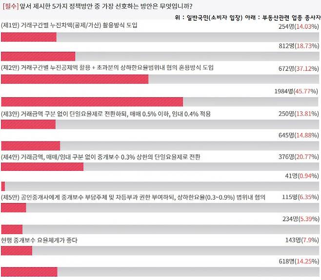 당시 권익위가 제시한 안이 △거래구간별 누진차액(공제·가산)을 활용하는 방식 △거래구간별 누진공제액을 활용하고 초과분의 상·하한요율을 범위 내 협의하는 혼용방식 △거래금액 구분 없이 단일요율제로 전환하되 매매 0.5% 이하, 임대 0.4% 이하로 상한선을 거는 방식 △거래금액, 매매·임대 구분 없이 중개보수 0.3% 상한의 단일요율제로 전환하는 방식 △공인중개사가 중개시장 상황에 따라 상·하한 중개요율(0.3%~0.9%) 범위내에서 중개보수 부담주체를 결정하고 비용을 차등부과하는 방식이었다.