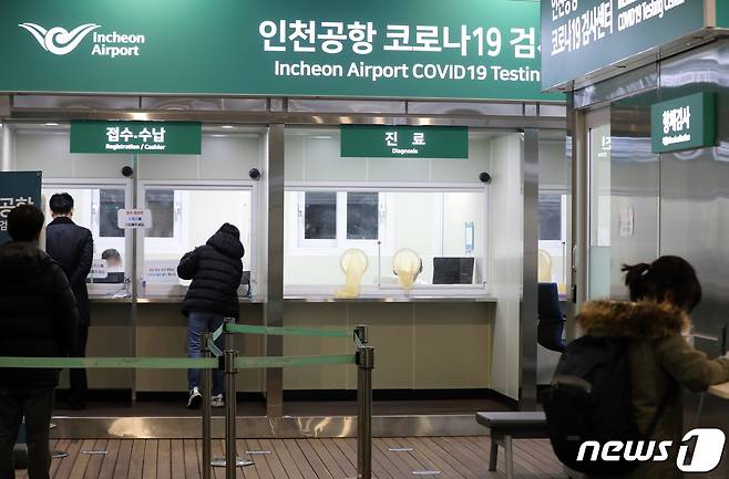 (인천공항=뉴스1) 정진욱 기자 = 26일부터 미국 입국자에 대한 신종 코로나바이러스 감염증(코로나19)음성 판정 증명 서류 제출 의무화 조치가 시행됐다. 해당 조치는 미국 시민권자를 포함한 모든 나라를 대상으로 시행된다. 사진은 26일 인천국제공항 2터미널에 설치된 인천공항 코로나19검사센터의 모습. 2021.1.26/뉴스1