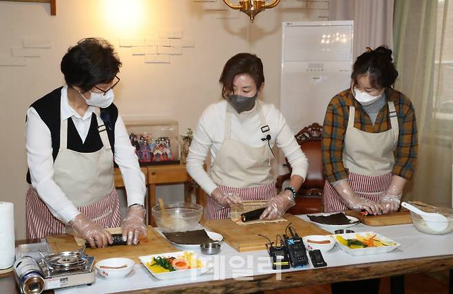 [이데일리 노진환 기자] 서울시장 보궐선거에 출마한 나경원 국민의힘 전 의원이 26일 오후 서울 마포구 연남동 '바투 스테이'에서 여성일자리 현장 체험프로그램에 참여해 김밥을 말고 있다. 국회사진취재단