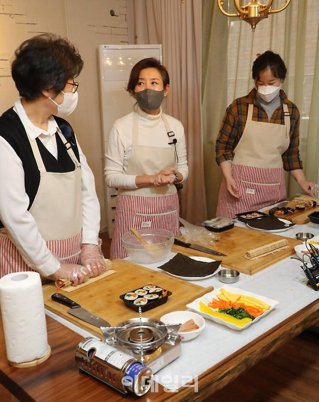[이데일리 노진환 기자] 서울시장 보궐선거에 출마한 나경원 국민의힘 전 의원이 26일 오후 서울 마포구 연남동 '바투 스테이'에서 여성일자리 현장 체험프로그램에 참여해 참석자들과 이야기를 하고 있다. 국회사진취재단