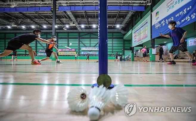 (서울=연합뉴스) 황광모 기자 = 26일 오후 서울 성동구 고산자로 금호스포츠센터에서 시민들이 보건 당국이 정한 거리 두기와 마스크 쓰기 등 코로나19 방역 수칙을 지키며 배드민턴을 치고 있다. 2021.1.26