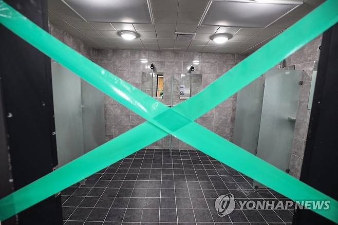 (서울=연합뉴스) 황광모 기자 = 26일 오후 서울 성동구 고산자로 금호스포츠센터의 샤워 실 입구에 사용금지 안내문이 붙어 있다. 보건 당국은 실내 체육시설 이용 재개를 허가 했지만 수영장 시설을 제외한 체육시설 내 샤워는 금지했다. 2021.1.26