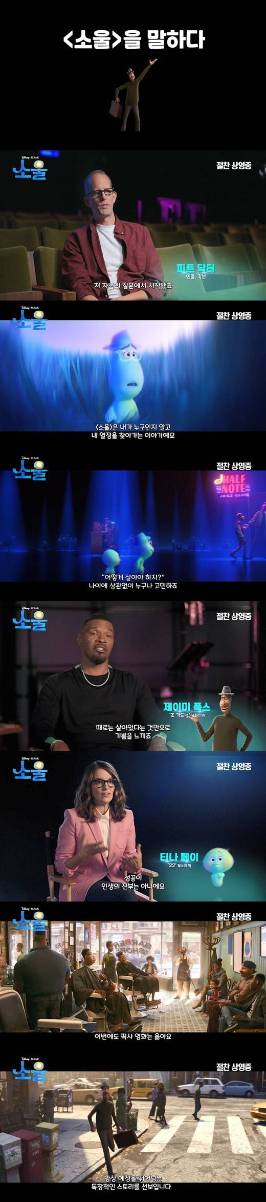 새해 첫 40만 이상 관객을 동원하며 개봉 첫 주 박스오피스 1위를 달성한 영화 '소울'이 피트 닥터 감독을 비롯한 제작진과 제이미 폭스, 티나 페이 등 출연 배우들이 직접 소개하는 ''소울'을 말하다' 영상을 공개했다.