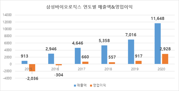 삼성바이오로직스는 본격 매출이 발생하기 시작한 2015년 대비 2020년 매출이 약 12배 증가했다. 5년간 연평균 매출액 상승률은 66.4%에 달했다.
