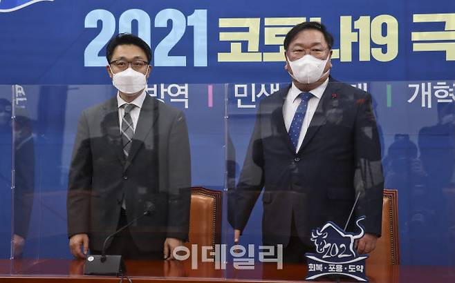 [이데일리 노진환 기자] 김태년(오른쪽) 더불어민주당 원내대표가 26일 오후 서울 여의도 국회를 예방한 김진욱 고위공직자범죄수사처장과 기념촬영을 하고 있다.