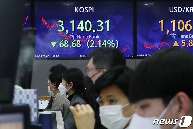 (서울=뉴스1) 민경석 기자 = 26일 오후 서울 중구 하나은행 명동점 딜링룸 전광판에 코스피 지수가 전일 대비 68.68p(-2.14%) 하락한 3,140.31을 나타내고 있다.