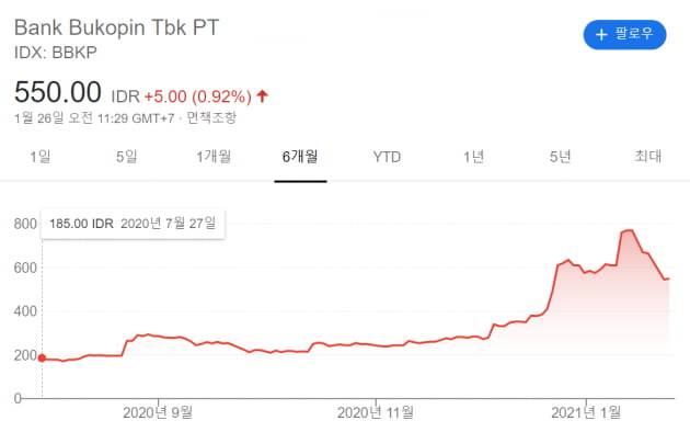 인수 후 은행 주가가 급등한 것이 되레 발목을 잡았다는 평가도 나온다. 국민은행 인수 당시 주당 189루피아였던 주가가 이달 중순 770루피아까지 올랐다. 반년만에 네 배 가량의 평가 이익이 난 것이다. 은행 인수 뒤 신용등급이 오르고(피치 기준 AA-→AAA) 예수금이 늘어난 게 긍정적으로 작용했다는 설명이다.