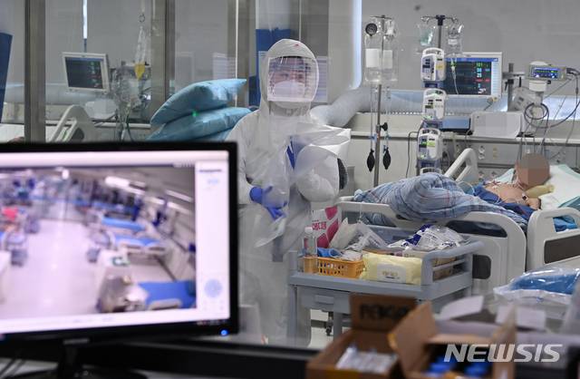 [안성=뉴시스] 김종택기자 = 전 세계적으로 신종 코로나바이러스 감염증(코로나19) 확진 판정을 받은 누적 인구가 1억명을 넘어선 26일 경기도의료원 안성병원 코로나19 음압격리병동 중환자실에서 의료진들이 환자를 치료하고 있다. 누적 확진자 1억명 돌파는 지난 10일 9천만명을 넘긴 지 16일만이다. 세계 코로나19 확진자는 지난해 11월 9일 5천만명을 넘긴 뒤 15일 안팎의 간격을 두고 1천만명씩 증가해 왔다. 2021.01.26.