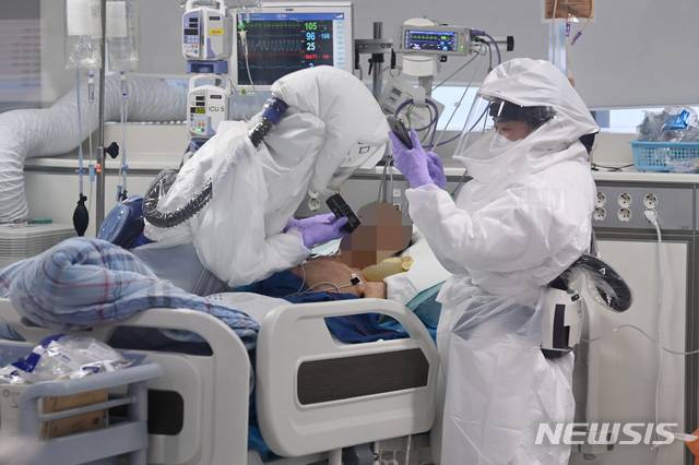 [안성=뉴시스] 김종택기자 = 전 세계적으로 신종 코로나바이러스 감염증(코로나19) 확진 판정을 받은 누적 인구가 1억명을 넘어선 26일 경기도의료원 안성병원 코로나19 음압격리병동 중환자실에서 의료진들이 환자를 치료하고 있다. 누적 확진자 1억명 돌파는 지난 10일 9천만명을 넘긴 지 16일만이다. 세계 코로나19 확진자는 지난해 11월 9일 5천만명을 넘긴 뒤 15일 안팎의 간격을 두고 1천만명씩 증가해 왔다. 2021.01.26.